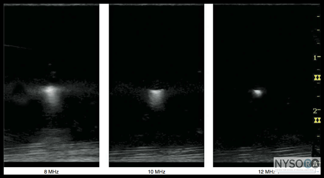 Figure 16: A demonstration of focusing effect. An electronic means can be used to narrow the width of the beam at specific depth resulting in the focusing effect and a greater resolution at a chosen depth. As previously discussed, it is common to use an electronic means to narrow the width of the beam at some depth and achieve a focusing effect similar to that obtained using a convex lens (Figure 16). This strategy improves the resolution in the plane because the beam width is converged. However, the reduction in beam width at the selected depth is achieved at the expense of degradation in beam width at other depths, resulting in poorer images below the focal region. Bioeffect and Safety The mechanisms of action by which ultrasound application could produce a biologic effect can be characterized into two aspects: heating and mechanical. The generation of heat increases as ultrasound intensity or frequency is increased. For similar exposure conditions, the expected temperature increase in bone is significantly greater than in soft tissues. Reports in animal models (mice and rats) suggest that application of ultrasound may result in a number of undesired effects, such as fetal weight reduction, postpartum mortality, fetal abnormalities, tissue lesions, hind limb paralysis, blood flow stasis, and tumor regression. Other reported undesired effects in mice are abnormalities in B-cell development and ovulatory response, and teratogenicity. In general, adult tissues are more tolerant of rising temperature than fetal and neonatal tissues. A modern ultrasound machine displays two standard indices: thermal and mechanical. The thermal index (TI) is defined as the transducer acoustic output power divided by the estimated power required to raise tissue temperature by 1°C. Mechanical index (MI) is equal to the peak rarefactional pressure divided by the square root of the center frequency of the pulse bandwidth. TI and MI indicate the relative likelihood of thermal and mechanical hazard in vivo, respectively. Either TI or MI >1.0 is hazardous. Biologic effect due to ultrasound also depends on tissue exposure time. Fortunately, ultrasound-guided nerve block requires the use of only low TI and MI values on the patient for a short period of time. Based on in vitro and in vivo experimental study results to date, there is no evidence that the use of diagnostic ultrasound in routine clinical practice is associated with any biologic risks.