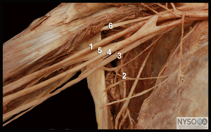 Figure 3: Anatomy of the terminal nerves of the upper extremity at the level of the axillary fossa. (1) axillary artery. (2) intercostobrachial nerve. (3) ulnar nerve. (4) median nerve. (5) radial nerve. (6) musculocutaneous nerve.
