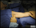 Figure 4. (A) Block of the intercostobrachial nerve. (B) Block of the medial cutaneous nerve of the forearm. (C) Block of the lateral cutaneous nerve of the forearm. Medial Cutaneous Nerve of the Forearm Block ![]() Figure 5: Medial cutaneous nerve of the arm (arrow). Anatomy The medial cutaneous nerve of the forearm originates within the medial cord. This nerve supplies branches to the skin of the medial side of the forearm (Figure 5). Indications The medial antebrachial cutaneous nerve is blocked by infiltration of local anesthetic into the subcutaneous tissue on the anteromedial and dorsomedial surfaces of the forearm just below the elbow crease. Along with blockade of the lateral antebrachial cutaneous nerve, this block is appropriate for the insertion of an arteriovenous graft on the forearm or other superficial procedures on the volar surface of the forearm. Technique A 1.5-in, 25-gauge needle is used to infiltrate local anesthetic subcutaneously over the entire medial aspect of the arm just below the elbow crease (Figure 4B).