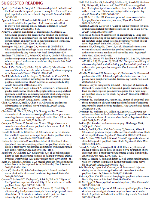 Figure 12: Continuous sciatic block in the popliteal fossa using a lateral approach with patient in the supine position. The needle is positioned within the epineural sheath of the sciatic nerve. After an injection of a small volume of local anesthetic to confirm the needle position a catheter is inserted 2-4 cm past the needle tip. Pre-loading the catheter is useful in facilitating the procedure.. The catheter is secured by either taping it to the skin or tunneling. There is no agreement among clinicians regarding what constitutes the ideal catheter securing system. Some clinicians prefer one method over the other. However, the decision regarding which method to use could be based on the patient's age, duration of the catheter therapy, and anatomy. The lateral approach may have some advantage over the prone approach with regard to catheter placement. First, the biceps femoris muscle tends to stabilize the catheter and decrease the chance of dislodgment, compared with the subcutaneous tissue of the popliteal fossa in the prone approach. Second, if the knee is to be flexed and extended, the side of the thigh is less mobile than the back of the knee. Finally, access to the catheter site is more convenient with the lateral approach compared with the prone approach. A commonly suggested starting infusion regimen is to infuse ropivacaine 0.2% at 5 mL/hour with a patient-delivered bolus of 5 mL every 60 minutes. ![]() |